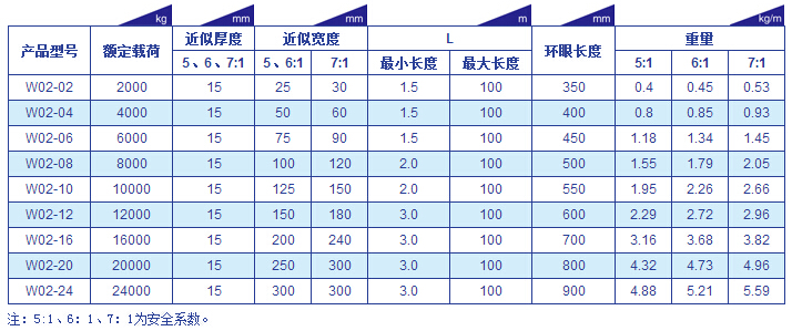 巨力W02型(重型環眼型) 是以國際上最優質的合成纖維為原料,使用了國際上最先進的織造技術和設備,經過不同的縫合方式縫制而成,它的生產是按照國家標準嚴格執行的,在吊裝作業時,不會斷開對人身造成傷害,而且它表面平滑,也不會對被吊物造成傷害。